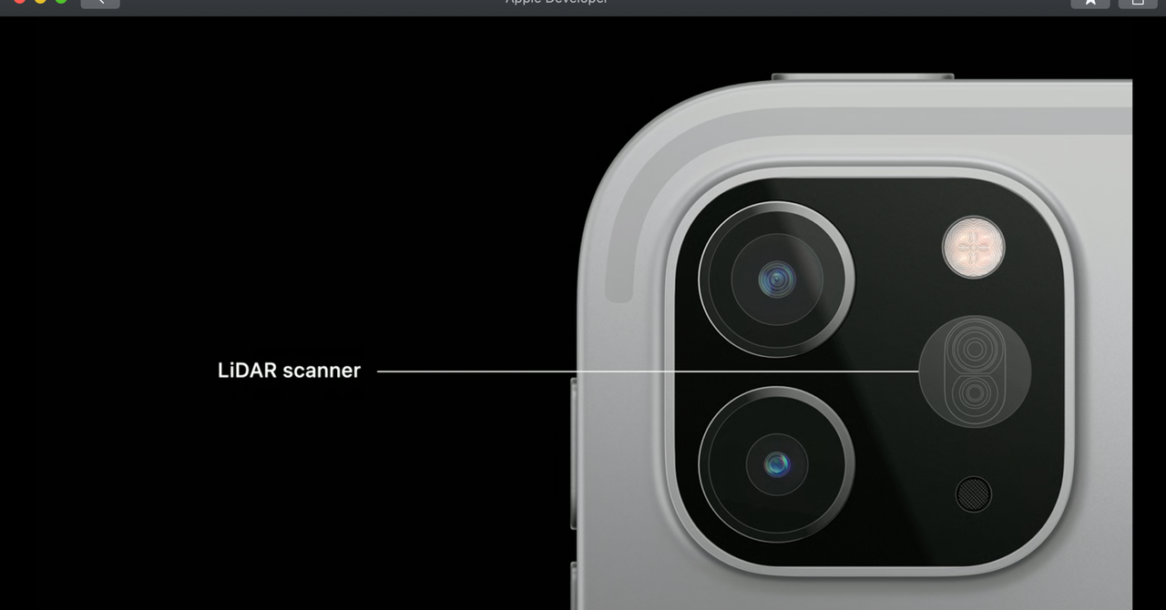 (새로운 iPad Pro는 LiDAR 스캐너가 탑재되어 있습니다. 이것은 눈앞의 물체에 빛이 도달하여 반사되어 돌아올 때까지의 시간을 나노초의 속도로 측정하여 거리를 판단 하는 데 사용됩니다. 이것은 5 미터까지 유효, 실내에서도 야외에서도 사용할 수 있습니다.)
